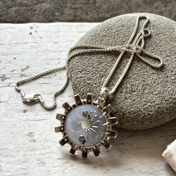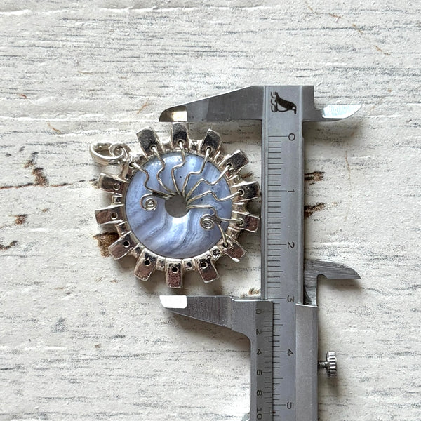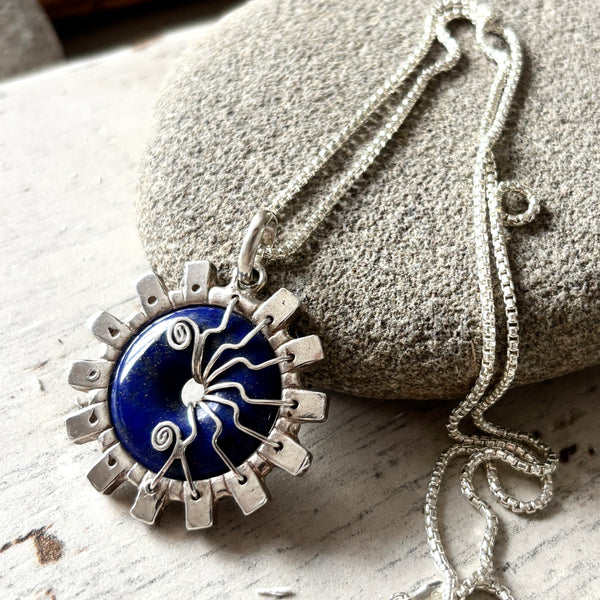 A chunky solid silver pendant, forged from Silver with a Malachite Carnelian Lapis or Blue Lace focal bead which has been wire wrapped and woven into place.