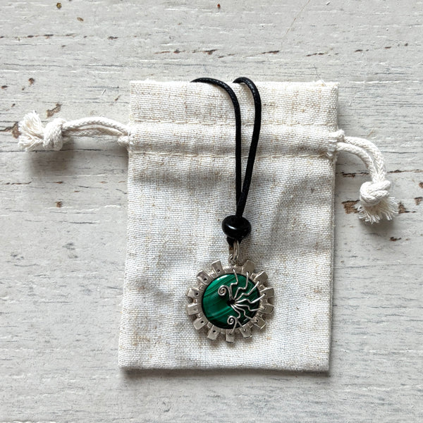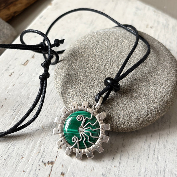 A chunky solid silver pendant, forged from Silver with a Malachite focal bead which has been wire wrapped and waving into place.