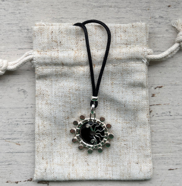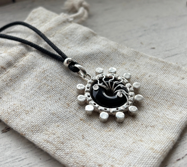 This is a contemporary Flower necklace crafted from Sterling silver with a black onyx centre piece.