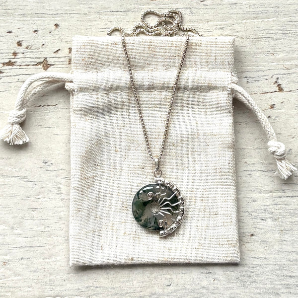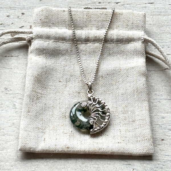 Discover the timeless beauty of our 20mm Moss Agate gemstone pendant necklace, handcrafted with care and elegance. This unique piece features a captivating Moss Agate gemstone, delicately captured in our signature wire-wrapped fossil design, suspended on a gleaming Sterling Silver chain. Each necklace is thoughtfully gift-wrapped in a natural linen pouch, perfect for gifting or cherishing yourself.